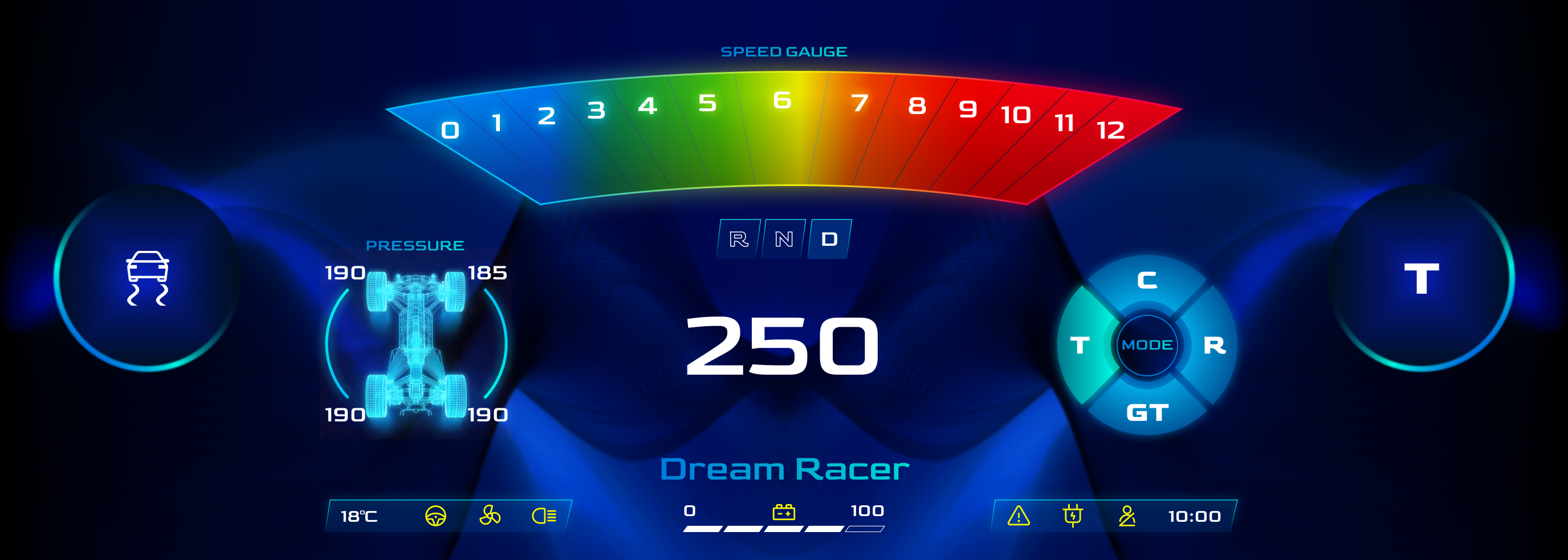 Traditional racing dashboards focus primarily on raw telemetry like speed, RPM, and fuel, which can feel functional but disengaging. The goal for Dream Racer was to create a cohesive racing experience that balances performance information with immersive, intuitive, and engaging interactions across the interface, interior, and exterior.